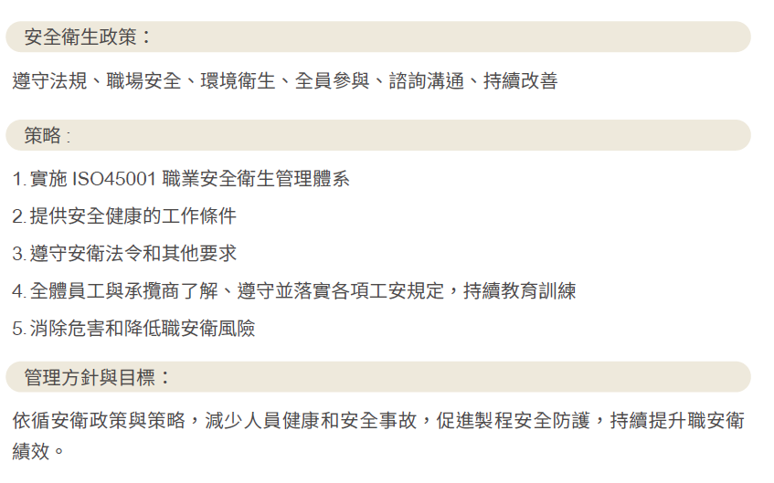 本公司為建立安全健康、舒適勞動的工作環境及持續降低職業災害率,制訂「職業健康安全承諾與政策」,為安全衛生管理最高指導原則。我們以安全作業為首要考量,以及持續改善的管理準則,積極改善工作場所環境、製造設備及作業方法,保障工作者及利害相關者的安全與健康。