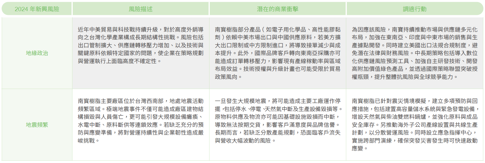 南寶樹脂致力建立完善之風險管理制度,由「審計委員會」及「永續發展委員會」作為公司風險管理的最高階層,協助董事會執行其風險管理職責,整體風險分析由「風險管理小組」統籌彙整管理,並向執行長進行報告。此外透過直屬於董事會的稽核小組,負責監測與稽核整個風險管理機制,透過內部查核作業以確保公司風險控制的有效性,適當管理潛在的風險。高階管理人員需在上述風險管理會議中呈報風險管理指標的評量結果、並接受永續KPI 之考核,直接影響其變動薪酬。為整合永續風險於整體風險管理制度,南寶樹脂從國際關注議題與聯合國永續發展目標識別出ESG 議題,透過利害關係人問卷納入不同的意見,以「雙重重大性分析」方式識別營運風險,由「永續發展室」確認九項重大議題的影響原因、影響領域、評估方式及對應的「風險」及管理措施。同時參考由「風險管理小組」提供之公司整體「風險評估分析報告」匡列出與重大議題相關之風險因子及永續管理重點項目,後續追蹤各負責單位之避險執行成效並揭露於永續報告書。重大性識別及永續目標制定程序每年進行一次。