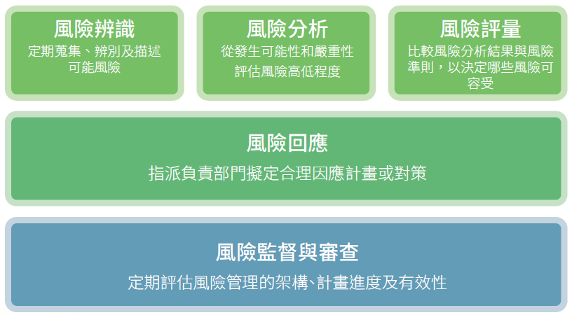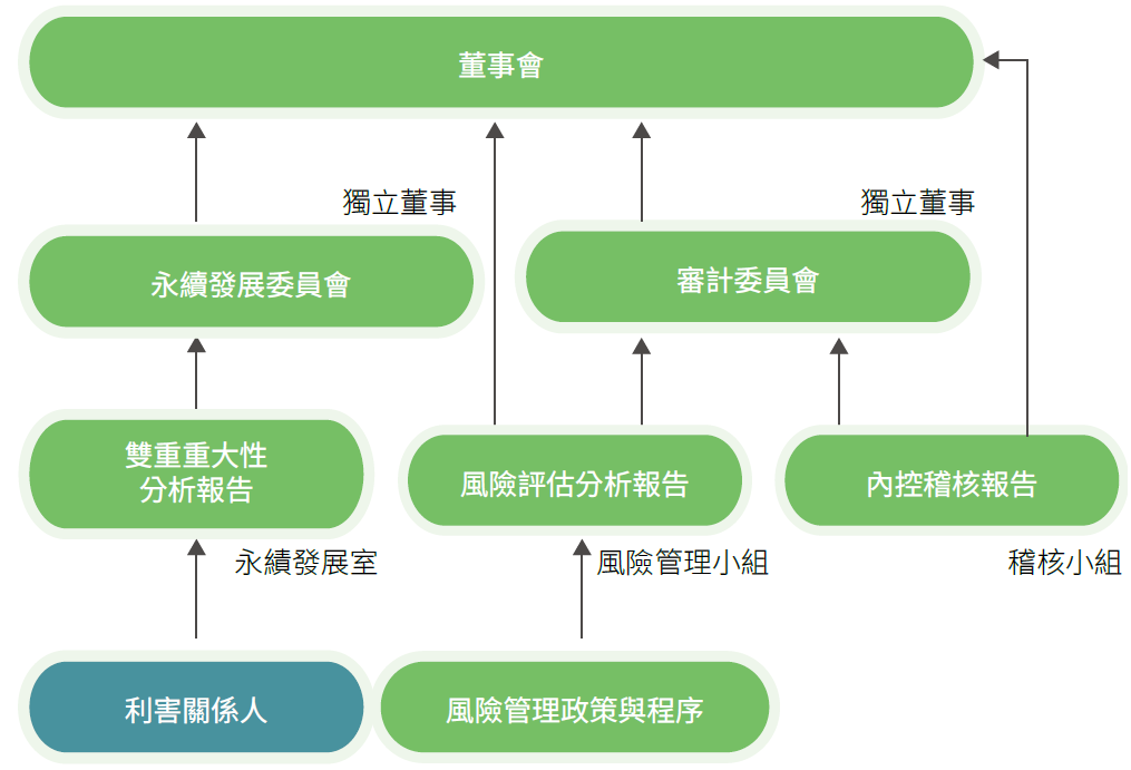 風險管理流程包括風險辨識、風險分析、風險評量、風險回應、風險監督與審查。每年定期由風險管理小組就E 環境保護( 含氣候與自然資源)、S 社會共融及G 公司治理等三大面向,考量發生頻率、衝擊程度以及控制程度,進行公司潛在風險與新興風險的評估及討論,並定期向審計委員會及董事會報告。