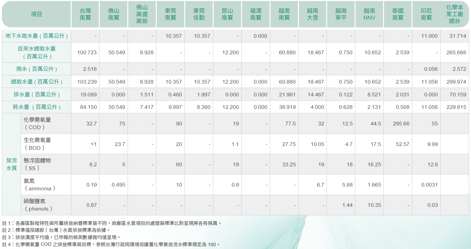2024 年,南寳樹脂(臺灣)取水總量為 103.239 千立方公尺(約 103,239 m³),較 2023 年增加 15.343 千立方公尺,增幅 17.46%。雖同期年度營收亦成長,但用水強度小幅上升 1.36%,未達原訂年度目標。