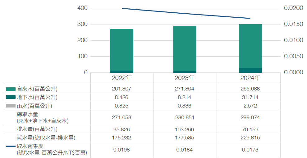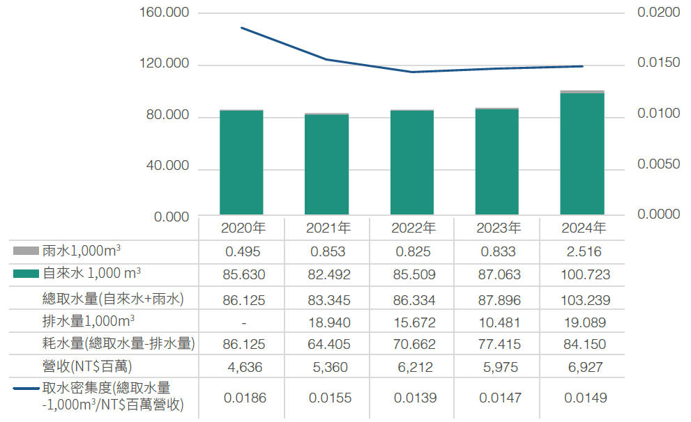 雖然取水總量增加,但因整體營收同步再創新高,取水密集度仍下降 5.98%,惟仍未達成 2024 年設定的 8% 減量目標。