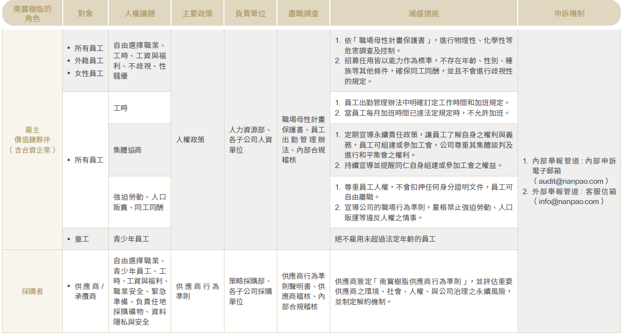為維護南寳樹脂及其子公司(以下合稱「南寳樹脂」)之員工及價值鏈夥伴(包含客戶、供應商 /承攬商、代理商、合資企業及地方社區)的基本人權,促進環境、社會、經濟之永續發展。南寳樹脂制定《人權政策》, 支持並尊重聯合國、國際勞工組織和其他國際組織的人權原則。南寳樹脂也遵守當地法律法規,保護人權,並實施了《反歧視和反騷擾政策》,為員工打造平等安全的工作環境。