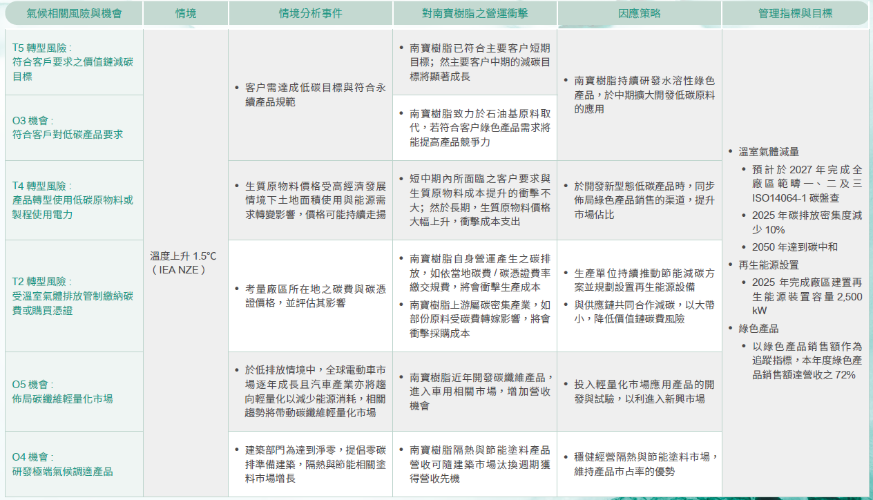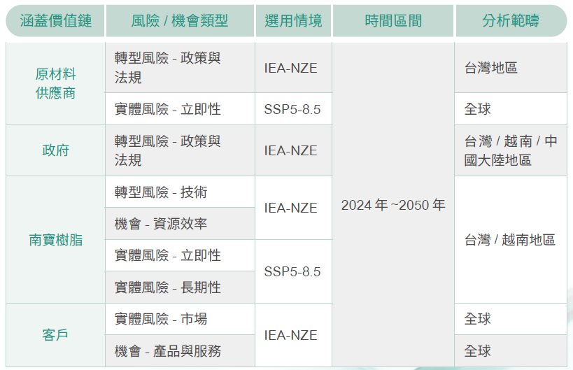 為評估氣候變遷對公司策略與經營目標的潛在影響,南寳樹脂參考國際能源總署( IEA )與政府間氣候變化專門委員會( IPCC )之研究報告,並結合公司現行發展方向,擬定兩種氣候情境進行分析,以評估不同情境下氣候變遷隨時間推移可能帶來的衝擊與挑戰。情境分析的目的在於提升公司對氣候風險的韌性,作為未來調整營運策略與資源配置的依據。