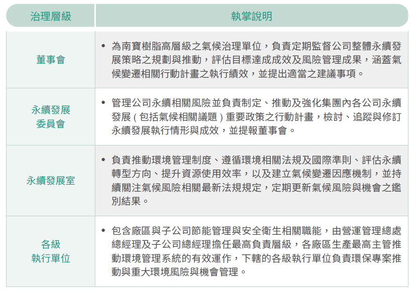 為強化永續環境績效與氣候風險治理,南寳樹脂建立完整的環境管理與氣候治理組織架構,且依所屬權責分層負責,致力達成環境管理有關的各項績效,各階層執掌說明如下所述: