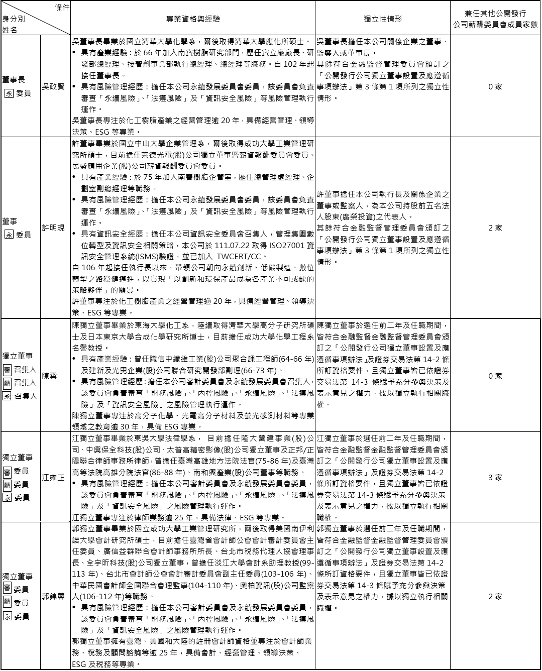 為健全監督功能及強化管理機能,南寳樹脂董事會下分設3個功能性委員會: