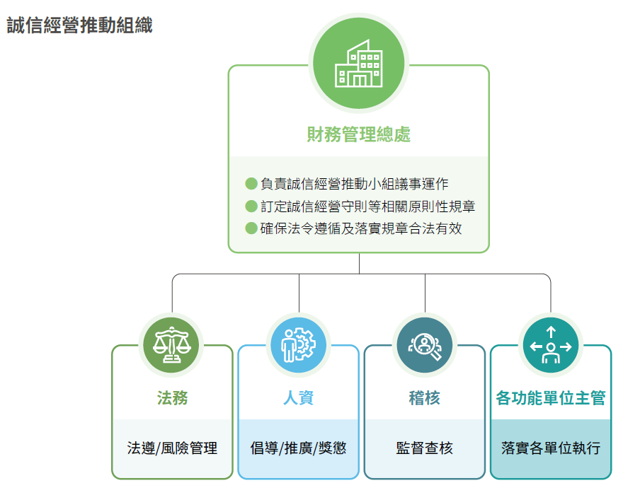 本公司由隸屬董事會層級之「誠信經營推動小組」作為專責單位,負責統籌及推動各項企業誠信經營相關事務,由執行長擔任召集人及會議主席,財務管理總處協理暨公司治理主管兼任執行秘書,並由各功能單位最高主管擔任推動小組成員,進行誠信經營政策與防範方案之制定及監督執行,本年度已於2025.06.30召開會議說明2024年執行情形、中長期推動計畫及2025年行動方案。