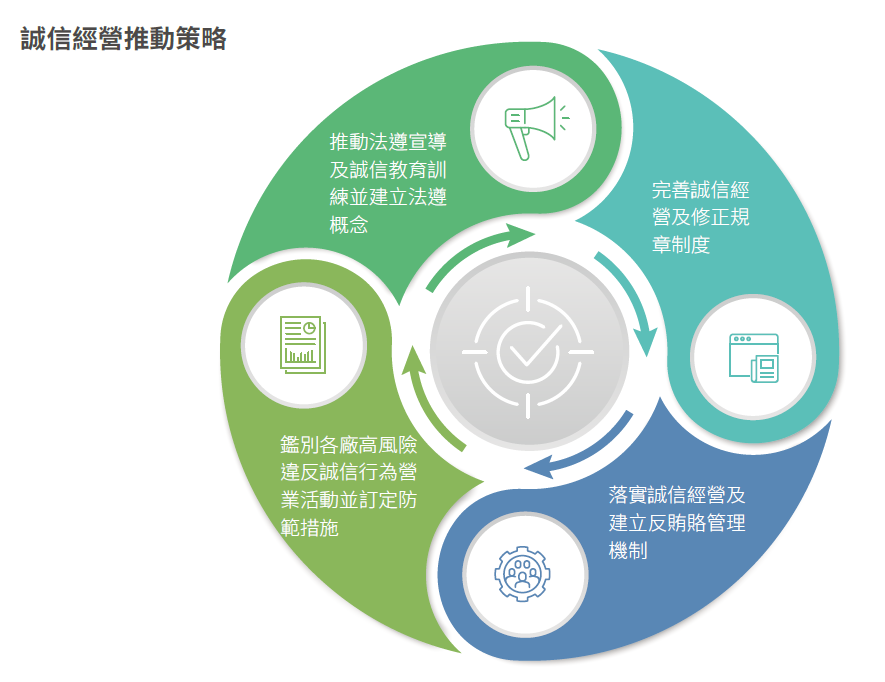 推動母公司內部各單位每年填寫「不誠信行為風險自評表」以辨識各營運單位之不誠信行為,並據以訂定防範不誠信行為方案。2025年度已取得共計21份,簽回率為38%,各單位回覆之風險自評內容將協助治理單位聚焦高風險領域,並納入後續查核重點。 |