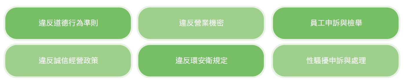 為落實執行道德行為準則及誠信經營相關政策之規定,本公司鼓勵員工或利害關係人舉報組織內或與交易對象間任何可疑不法或不誠信行為,包括以下幾大面向: