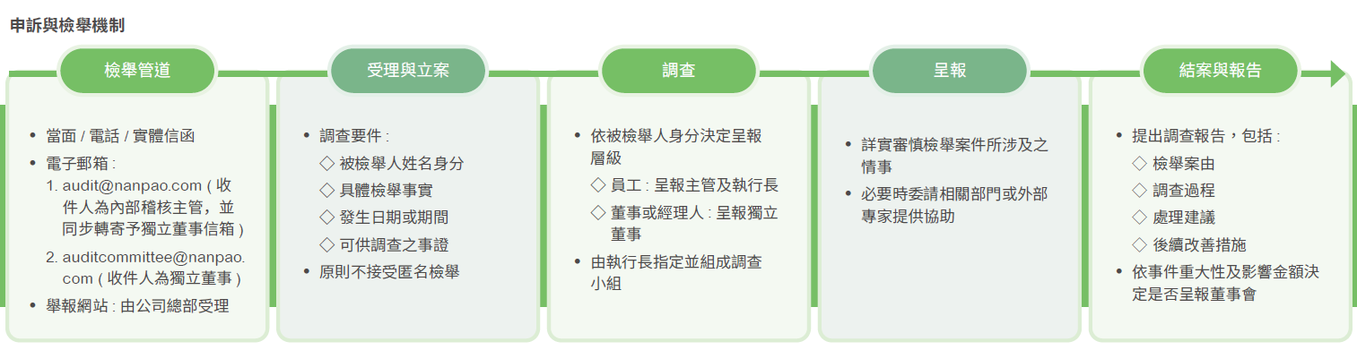檢舉案件可採取「親身舉報」、「電話舉報」及「投函舉報」(紙本或電子信函)三種管道進行,並設有獨立檢舉信箱與舉報專線,另揭露審計委員會(獨立董事)直接收發之電子郵件信箱,檢舉情事若涉及董事或高階經理人,將呈報至獨立董事,並建立檢舉人保護制度,對於檢舉人身分及內容均確實保密,承諾保護檢舉人不因檢舉情事而遭不當處置。2025年並無接獲涉及不誠信行為之檢舉案件。